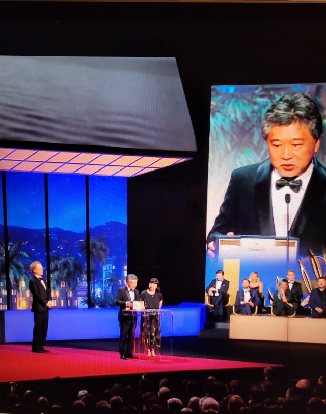 代理で舞台に上がった是枝裕和監督。映画『怪物』の少年2人をどうやって映像にするか、自分の目も通して考えたそうだ。「世界は生まれ変われるか」と常に自分に問いながらこの作品に関わった、といかにも是枝監督らしいエピソードを披露してくれた。
