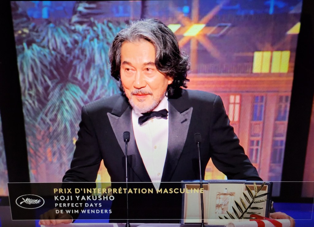 Wim Wenders監督のPerfect Daysで主演した俳優の役所さん。賞は大好きだが、カンヌのような大きな国際舞台でのスピーチは苦手と前置きして、平山のような魅力的な役をもらって光栄だと喜んでいた。
