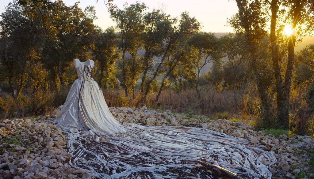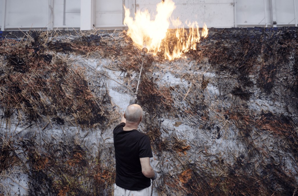 最初に画面に登場するのはプラスターでできたウェディングドレス。頭の部分は針金、ブリック、鉄などいろいろな材料でできている。また大きなキャンバスに分厚いペイントをつけて火で焼いたり水拭きしたりと目を見張るテクニックで独特のアートが作られる。倉庫を改造して作った広いアテリエの中を自転車で回っている彼の姿も印象的だ。