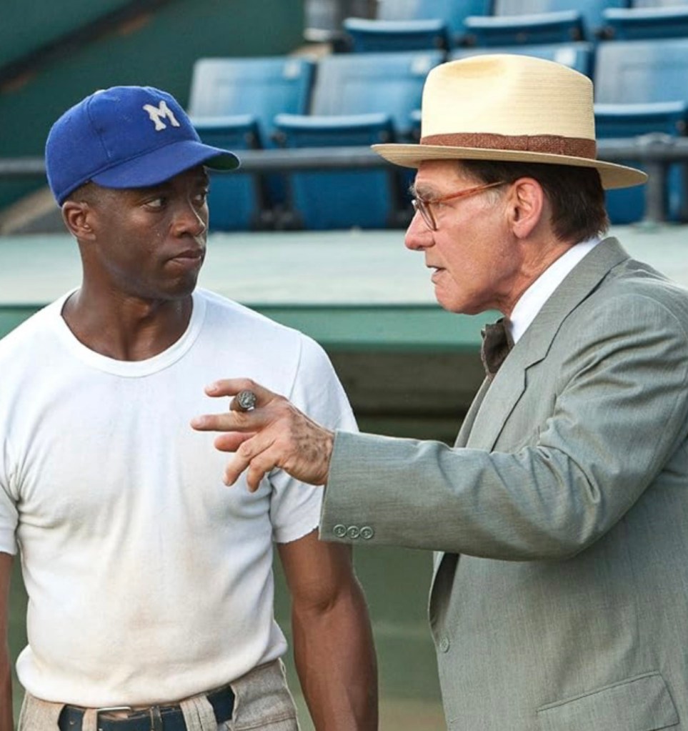 白人社会から非難を浴びてもロビンソンを雇用したブルックリン・ドジャースのオーナー、ブランチ・リッキーを演じたハリソン・フォードもすごい。昔の記録からリッキーの体つきや声をリサーチして、ボイスコーチを雇いながら成り切ることに専念した。数多くの映画歴で自分自身が特に満足できる作品だそうだ。